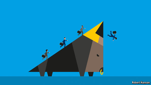 Starting with a look at how companies pay for investment, Mr Minsky described three kinds of financing. The first, which he called hedge financing, is the safest: companies can repay debts with their earnings. They have limited borrowings and good profits. The second, speculative financing, is a little riskier: companies can cover their interest payments but must roll over their principal. This works fine normally but not in downturns. The third, Ponzi financing, is the most dangerous. Earnings cover neither principal nor interest; firms are betting that their assets will appreciate. If not, they are in trouble. Economies dominated by hedge financing—those with strong cashflows and low debt levels—are stable. When speculative and, especially, Ponzi financing become popular, economies are vulnerable. If asset values fall, overstretched investors must sell their positions. This further hits asset values, causing pain for even more investors, and so on—a downward spiral now sometimes called a “Minsky moment”. Investors would have done better to stick to hedge financing. But over time, particularly when the economy is healthy, debt is irresistible. When growth seems guaranteed, why not borrow more? Banks add to the dynamic, lowering their standards the longer booms last. If defaults are minimal, why not lend more? Mr Minsky’s conclusion was unsettling: periods of stability breed financial fragility.